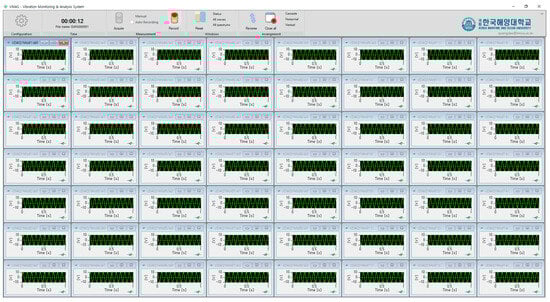 AE measurement systems, as well as high-performance measurement systems, are required to acquire and store large amounts of data from numerous channels at a high sampling rate. To test this system, a configuration of the DAQ devices was created with MAX using the NI cDAQ-9719 chassis, along with 16 NI-9223 modules. All the 56 available channels were measured at a sampling rate of 1 MS/s per channel. The three HDDs mentioned in Section 3 were employed. The operating window of the program with 56 measurement channels is shown in Figure 10.