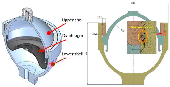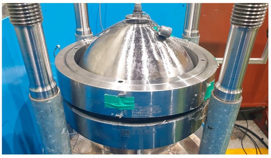 In this case study, the program was used to detect and locate crack sources early by monitoring AEs during an in situ load test for a new hydraulic accumulator. The accumulator configuration is shown in Figure 11. During the testing, the operational oil was cyclically pumped into the accumulator. In each cycle, the oil pressure ascended to the peak amplitude, reaching 400 bar, and remained at this level for 0.2 s before declining to 100 bar. Each cycle was completed within approximately 0.8 s. These pressure settings were significantly more severe than those used in the operational design. The test was continued until the new accumulator was entirely broken.