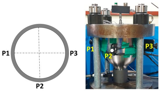 After 18 h of testing, corresponding to 81,000 load cycles, the Kisler sensors detected AE events from the accumulator. Figure 13 illustrates a measured AE event indicating a potential crack in the accumulator that may not be visible yet. In the event, a burst wave was generated with frequencies greater than 120 kHz, beyond the detection range of the Vallen sensors. Although all eight channels were recorded to gather extensive information about the accumulator’s condition and to verify the effectiveness of the data-writing algorithms, only the AE waves measured by the Kistler sensors were able to reveal the AE events. Figure 13d shows a comparison of the arrival times of the AE event waves at positions P1, P2, and P3, which are represented by black, red, and blue, respectively. The wave first arrived at P2, followed by P1, and finally at P3. The time differences in arrivals at P1 and P3 were minimal, suggesting that the fracture location was adjacent to P2 in the direction of P1.