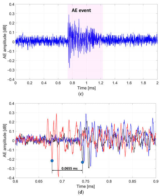 AE event wave measured by the Kistler sensors. (a) At position P1, (b) at position P2, and (c) at position P3. (d) Comparison of the arrival times of the AE event wave to positions P1, P2, and P3.