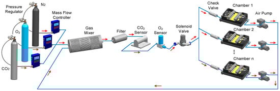 The proposed gas supply system is shown in Figure 1. Three Mass Flow Controllers (MFCs) are used to accurately regulate the flow rate and volume of N2, O2, and CO2 from the high-pressure cylinders to the gas mixer [17,18]. The gas mixer facilitates the mixing of gases within the system. Each individual chamber in the system is connected to a micro pump and a check valve. These pumps circulate gas from the mixer to the culture chambers and back, creating a closed-loop gas supply system. The check valve prevents air from entering the system when a chamber lid is opened. The state of each chamber lid (open or closed) can be identified by a switch sensor. The pump is automatically deactivated when the chamber lid is open and only operates when the chamber lid is closed. The gas sensor is positioned downstream of the gas mixer and upstream of the chambers, along the flow direction, to measure the gas concentrations (volume fraction). Additionally, a solenoid valve, which is a three-way valve, is positioned between the gas sensor and the culture chambers. It can be controlled to switch between two positions: either to the atmosphere or the system.