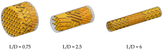 The static mixer consists of a closed thin-walled cylindrical tube filled with SV mixing units. The length–diameter ratio (L/D) is a crucial parameter for the design and selection of the mixing chamber in addition to internal volume. To investigate the optimal L/D of the mixer for the gas system, three mixer structures with L/D ratios of 0.75, 2.5, and 6 are developed, all with an internal volume of 800 mL, as shown in Figure 2. In each mixer, the thickness of the spoiler elements is 1 mm, and three groups of SV units are arranged along the length at a dislocation angle of 60°. To compare the mixing efficiency of mixers with different L/D ratios, a binary gas mixing simulation is employed as a research model to simplify numerical analysis and reduce computational load. Each mixer includes two gas inlets and one gas outlet.