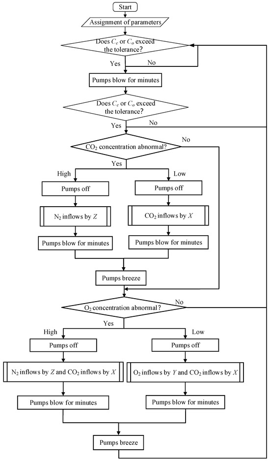 For the calculation method of inflow volume, a step-by-step adjustment strategy is adopted to ensure the CO2 concentration preferentially and the subsequent gas introduced always contains the target proportion of CO2 so that the CO2 concentration remains unchanged during the time of adjusting the O2 concentration because of the importance of CO2 concentration. For the intermediate concentration of O2, the theoretical calculation value (Co1) is used during the process instead of the measured value for the convenience of calculation, while the measured value will be susceptible.