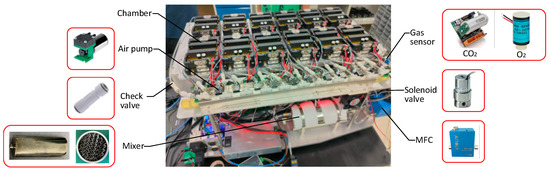 A multi-chamber cell incubator is fabricated and assembled based on the gas supply system, as shown in Figure 4. The incubator is a compact device containing 12 chambers arranged in two rows. The gas system components are mainly installed at the rear of the incubator, including air pumps (Thomas Diaphragm pump, model 2002 VD BLDC, Monroe, LA, USA), CO2 sensor (Novasis Innovazione Novagas2, model NG2-A-2, Pont-Saint-Martin AO, Italy), O2 sensor (Figaro, model KE-25LF, Maxell, Tokyo, Japan), MFCs (AITOLY, model MFC300_RS485, Wuxi, China), gas mixer (Henan Xingchao Electromechanical Equipment Co., Ltd., Xinxiang, China), check valve (SMC, model AKH06, Tokyo, Japan), and solenoid valve (AVIC ZEMIC, model FOA-3T24, Xi’an, China). The gas mixer is designed as an enclosed thin-walled cylinder, filled with three SV static mixing units each positioned at a 60-degree angle to the adjacent units. The total volume of the gas circulation part is 1800 mL, with 950 mL for the gas mixer and 850 mL for the rest.