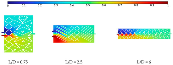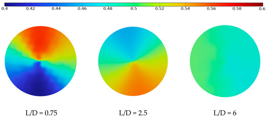 The simulation of a gas mixer can generate velocity and concentration fields, with the concentration field being the main focus for evaluating the mixing effect. The concentration field distribution results of the static mixer with various L/D ratios under identical operating conditions are shown in Figure 5 and Figure 6. Upon reaching a steady state, it is observed that the gas concentration gradient inside the SV mixer with different L/D ratios of 0.75, 2.5, and 6 are approximately 20%, 8%, and 2%, respectively. It is noted that a higher L/D ratio results in improved gas phase uniformity and enhanced gas mixing efficiency within the mixer.