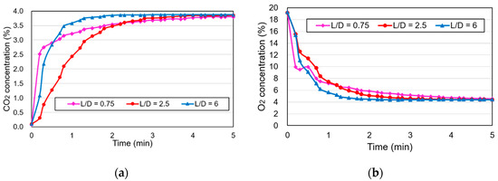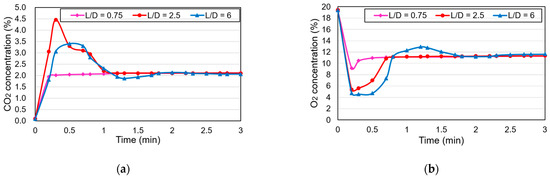 Concentration changes of CO2 (a) and O2 (b) in an open system with mixers with different L/D ratios.