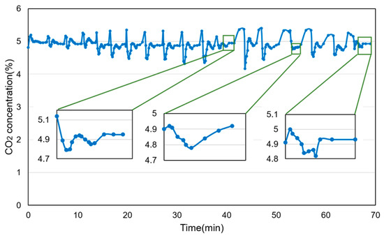 Following the mixer performance experiment, an optimal mixer was selected for the subsequent three-gas mixing experiment. All components were connected to the circulation system as illustrated in Figure 1. As depicted in Figure 3, the gas system of the incubator predominantly remains in a breezing state; therefore, there are three different operating scenarios to be considered, on which the gases need to be consumed more. Then, the three-gas mixing experiments were conducted in the following scenarios: