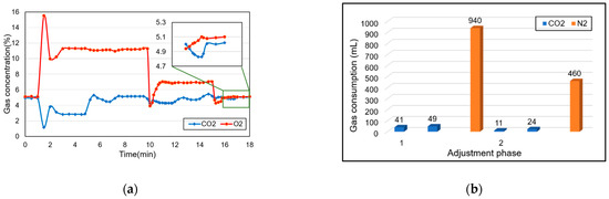 (a) Concentration changes of CO2 and O2 when initializing (b) gas consumption during each adjustment.