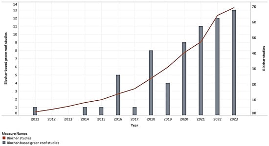 The number of studies on biochar-amended green roofs and biochar recorded in the Scopus database by year of publication from 2011 to 2023.