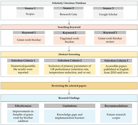 Figure 1 illustrates an increasing trend in the number of studies on both biochar and biochar-based GRs from 2011 to 2023, based on data from the Scopus database. Notably, there has been a significant surge in research interest in biochar in recent years, especially from 2018 onwards. Moreover, Figure 1 also highlights that there has been relatively limited research on biochar in GRs compared to its application in other research areas. A Scopus-based search using different keywords further highlights the limitation of biochar–GR studies, as shown in Figure 2. Among 6200 search results for GRs, only 75 studies were found relevant to biochar. While biochar has been extensively studied with approximately 35,000 studies, research attempts specifically focused on biochar-amended GRs have been relatively limited. Although there is growing information on how biochar affects GR functions, there is a lack of comprehensive reviews on the performance of biochar-amended GRs. The Scopus database identified only five review papers. Four of them focus on green infrastructure and geotechnical engineering structures rather than specifically on GRs [30,32,33,34]. The study by Lee and Kwon [35] is the only review that focusses exclusively on examining the application of biochar in GRs. Although this review aimed to provide an overview of the impacts of biochar on GRs, it lacks an in-depth investigation and discussion on specific categories of benefits that biochar amendment brings to GRs. It also does not thoroughly address various barriers and limitations of biochar amendment in GRs. Therefore, this review aims to comprehensively quantify and qualify the performance of previous studies and application of biochar amendment in GR systems across various benefit categories. It also seeks to identify research opportunities by highlighting gaps in the current understanding of the benefits provided by GR–biochar systems. Additionally, the review thoroughly examines barriers to biochar amendment in GRs, including environmental concerns, economic challenges, and policy-related hurdles. By doing so, the review can accurately highlight limitations and offer recommendations for future research. Furthermore, it provides directions for future studies by identifying optimal biochar-based variables, such as biochar application methods, amendment rates, and particle sizes. Despite the limited research available, the significant potential of biochar highlighted by preliminary studies could attract the interest of researchers and garner attention from authorities and the community, thereby promoting the recognition and adoption of biochar in GRs. Moreover, detailed information from past research findings could work as a foundation for further investigation of biochar in GRs. The selection of papers for this review was based on the following criteria: (1) the presence of numerical or quantifiable results that were reported, (2) inclusion of primary GR performance parameters such as runoff retention rate, temperature reduction, and concentrations of total phosphorus (TP) and TN, and (3) publications within the period from 2010 to the present. The reviewed papers were sourced from the Scopus, ResearchGate, and Google Scholar databases. Figure 3 presents a flow chart illustrating the reviewing methodology adopted in this research.