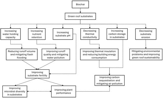 - The research on biochar amendment in GRs has been uneven, with the majority of studies focusing on runoff retention, improved runoff quality, enhanced plant performance, and microbial diversity. Certain other benefits of biochar for GRs, such as thermal reduction, carbon sequestration, and control of soil erosion, have received relatively less attention. Future studies should address this imbalance to provide a more comprehensive understanding of biochar’s full range of benefits.