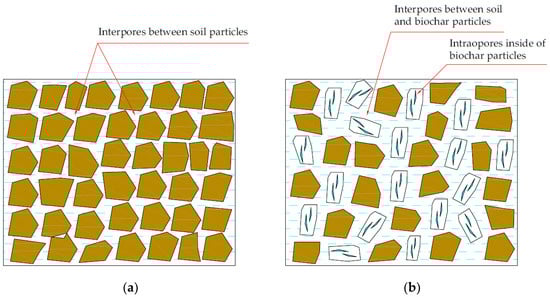 Mechanisms by which biochar increases soil porosity and improves water-holding capacity: (a) low-porosity soil structure without biochar, (b) high-porosity soil structure due to inter-pores between soil and biochar and intra-pores within biochar particles [56].