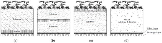 Commonly used biochar application methods in green roofs: (a) biochar at the bottom of the substrate, (b) biochar in the middle of the substrate, (c) biochar at the top of the substrate, and (d) biochar thoroughly mixed with the substrate.