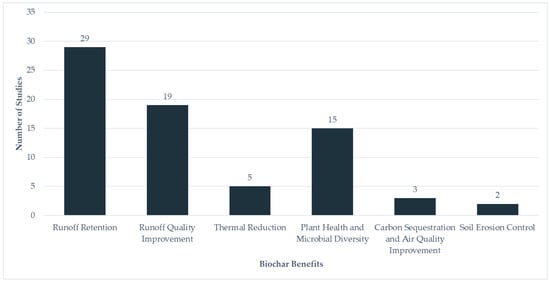 The benefits of biochar for GRs have not been studied uniformly, as depicted in Figure 7. As can be seen in the figure, runoff retention has received the most research attention. The impacts of biochar on runoff quality, plant performance, and microbial diversity have also been extensively studied. Although thermal reduction is one of the most studied benefits of GRs in general [3], it has not been adequately investigated in biochar-related research. An uneven research focus becomes apparent from the figure, especially when considering benefits such as thermal reduction, carbon sequestration, and soil erosion control. The following sections specifically describe the previous performance of biochar-amended GRs across different benefits of biochar.