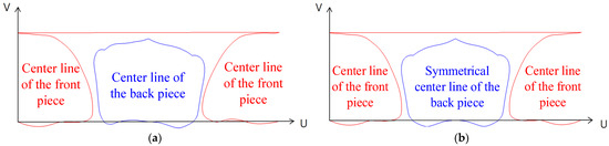 A minor skew sometimes appears on the subject’s neck in a neutral position. In such circumstances, the centerlines generated from the digital scan model are usually not symmetrical. Besides supporting and immobility orthoses, we also consider correcting the state of neck skew when wearing the orthosis. Therefore, we built a symmetrical centerline template for the front and back pieces that can remain symmetric when transferring to the other. We normalized the U and V axes in the cylindrical coordinates, as shown in Figure 6a, to mirror half of the centerline on the line across the chin and sternum to make a completely symmetrical centerline (Figure 6b). Based on the coordinate transfer from Cartesian to cylindrical, it is then transferred back to Cartesian to generate an orthosis geometry model.