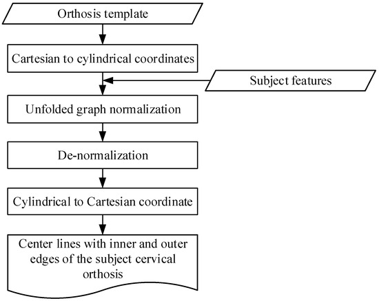 The orthosis template contains 12 anatomical neck features and 2 central lines with the inner and outer edges of the front and back piece orthosis. However, the neck morphology of individuals varies. Transferring an orthosis template to an individual geometry is crucial for customizing automated cervical orthoses. Therefore, we applied normalization and denormalization processes to achieve a customized automated orthosis design. Figure 7 illustrates the whole transferring procedure. The neck orthosis template was transferred from Cartesian to cylindrical coordinates to adapt the neck geometry. We normalize and then de-normalize the unfolded graphs of the template and subject. After normalizing and de-normalizing, the subject’s central lines with the inner and outer edges of the two-piece orthosis were generated. We then reversed the transferred coordinates from cylindrical to Cartesian. When the inner and outer edges of the two-piece orthosis are set, the cover region on the neck of the two-piece cervical orthosis can be determined.