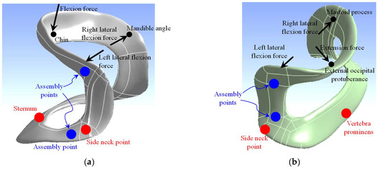 This study adopts a two-piece cervical orthosis that covers the subsurface bones surrounding the neck. As shown in Figure 1, the designed cervical orthosis accommodates 12 anatomical features. They include the chin, mandibular angles, side neck points, clavicles, sternum in the front piece, external occipital protuberance, mastoid processes, and spinous process of the seventh cervical vertebra (C7) in the back piece. All these features are located on the subsurface of the corresponding anatomical bone.