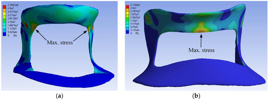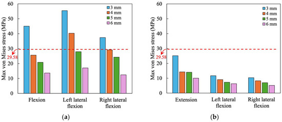 In the finite element analysis, the magnitudes of the loads listed in Table 2 and Table 3 are based on the strength of the neck muscles [20,21]. These test data were measured from healthy persons. This means that the loads applied to the orthosis in the finite element analysis were the maximum forces a healthy person could apply. For the orthosis with long-term wearing, the loadings listed in Table 2 and Table 3 and the stresses listed in Table 4 and Table 5 cannot be used to evaluate the fatigue issues. According to the S–N curves from the fatigue testing data of PLA specimens reported by Ezeh and Susmel [22], the fatigue strength is approximately one-sixth of the tensile strength for the fatigue limit ( cycles). Using a tensile strength of 29.58 MPa, as seen in Table 1, the fatigue strength would be 29.58/6 = 4.93 MPa. Under flexion, the 5 mm thickness front piece orthosis has a stress of 20.85 MPa, as shown in Table 4. Thus, the maximum flexion force applied on the front piece to reach the fatigue limit is 135.06/(20.85/4.93) = 31.94 N. Table 6 and Table 7 lists the loadings on the front and back pieces orthosis in which all stress values are lower than fatigue strength. It was seen that as the orthosis thickness increases, the allowable loading on the orthosis increases.