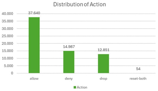 Action: the “Action” field in a firewall denotes the prescribed response to network packets and acts as a categorical variable, including ‘allow’, ‘deny’, ‘drop’, and ‘reset-both’ as potential values. ‘Allow’ permits passage of the packet through the network; ‘deny’ blocks it; ‘drop’ silently discards it without notifying the source; and ‘reset- both’ sends a reset packet to both source and destination, terminating the connection. As demonstrated in Figure 1, the distribution of actions is as follows: ‘allow’ at 37.640 instances, ‘deny’ at 14.987, ‘drop’ at 12.851, and ‘reset- both’ at 54, reflecting the varying frequencies of each response type in the analyzed dataset.