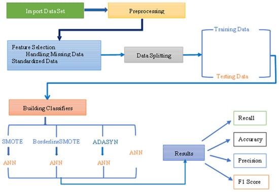 The dataset reveals a significant number of instances classified as “allow” (37.640 occurrences), indicating a prevalence of packets allowed by the firewall. Additionally, there are actual occurrences of samples classified as “deny” (14.987 occurrences) and “drop” (12.851 events), representing packets that were denied or dropped by the firewall, respectively. However, the subclassification class “reset-both” is severely underrepresented in the dataset, with only 54 occurrences. This class imbalance raises concerns about the model’s performance and ability to predict the “reset-both” subclassification accurately. Moreover, the restricted quantity of instances encapsulated in the “reset-both” class might constrain the model’s capacity to generalize and apprehend the complexity inherent in real-world situations, particularly those where the firewall undertakes the reset of packets. Furthermore, within the methodological constraints of the study, the analysis was conducted solely using ANNs and SMOTE. The sequential process adhered to within this research study is depicted in Figure 2.