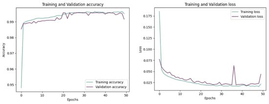 These results underscore the model’s robustness and efficiency, highlighting its ability to achieve near-perfect accuracy with minimal overfitting. The minor variations in the validation loss suggest that the model handles the complexity of the data well, maintaining a high level of performance throughout the training process.