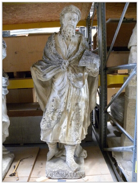 Biodeteriorated limestone outdoor monument of Aristotle, located at Dornava mansion (Slovenia) from the middle of 18th century. The statue shows discoloration phenomena and superficial disintegration of limestone. This photo was taken by Maja Gutman Levstek.