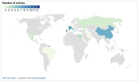 The number of studies on biodeteriorated limestone using molecular identification approaches by country marked up on the world map in different colors according to the number of articles.