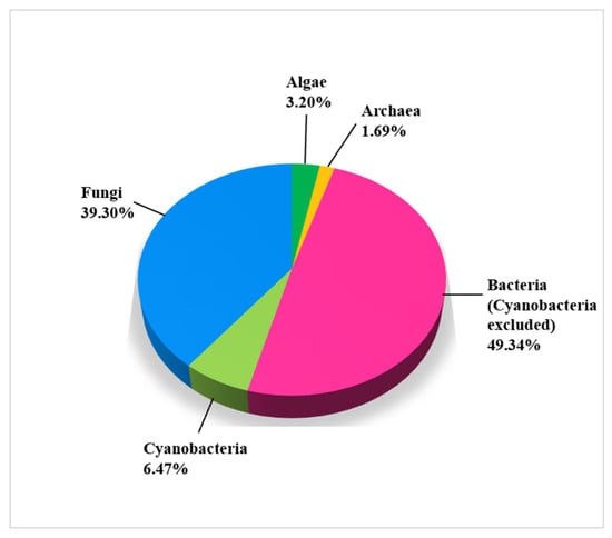 As seen in Figure 3, a generous number of microbial isolates from limestone cultural heritage assets belong to bacteria (55.81%, of which 6.47% belong to cyanobacteria). The second most frequently isolated group identified by the molecular markers is fungi (39.30%). There are few research articles on the use of molecular methods identifying algae, so they represent only 3.20% of all microbes. Archaea are the least studied microbial group, representing only 1.69% of all microbial records.