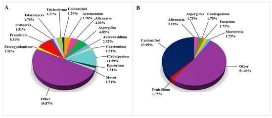 Fungal taxa on biodeteriorated limestone (Figure 4) were extensively studied using CD methods (Figure 4A), as 397 out of 626 records were obtained this way, while the remaining 229 taxa were detected using CI approaches, as shown in Figure 4B, where we list all of the genera occurring in more than 1.5% of studies. All genera occurring in less than 1.5% were grouped in the category “Other”. Among them, the genera Clonostachys, Cyphelophora, Emericellopsis, Fusarium, Geosmithia, Mortierella, Ovicillium, and Stachybotrys were recorded with the frequency of 1.0–1.5%, while the same frequency was noticed for the genera Coniosporium, Exophiala, and Rhodotorula using CI techniques. In the CI studies, 38% of fungal taxa remained unidentified at the genus level (Figure 4B), indicating that these taxa most likely have not yet been cultured, if sequences do not report “artifact taxa” due to the possibility of sequencing errors. Of the isolated cultures, only 1.26% of the taxa recorded remained unidentified and were assigned only to a higher taxonomic level.