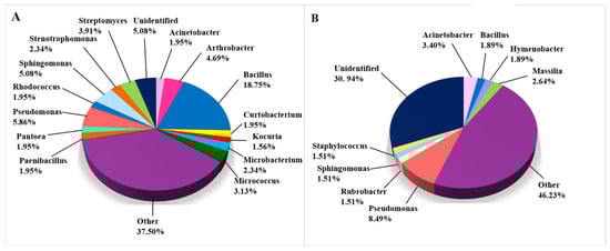 The bacterial taxa that were isolated and identified on biodeteriorated CHL are depicted in Figure 5. In contrast to the fungal taxa, the bacterial taxa were detected mainly using CI methods (530 of 786 records, Figure 5B), while the detection of 256 bacterial taxa relied on CD methods (Figure 5A). The percentage of genera determined is shown in Figure 5 for those with a frequency of more than 1.5%, while genera occurring in less than 1.5% are joined in the category “Other” for the taxa determined using CD approaches. For the taxa determined with CI approaches, the occurrence of genera specified under “Other” was less than 3%. Only 5.08% of cultivated bacterial taxa remained unidentified, while 30.0% of all taxa obtained using CI methods remained unclassified, possibly representing not-yet-cultivated organisms. The genus Bacillus was most often isolated from CHL (48 records), while Pseudomonas was most often detected in CI assets (45 records). Arthrobacter agilis, which was isolated and determined in six articles, is the most frequently occurring species among bacteria in biodeteriorated limestone of cultural heritage significance. Frequent taxa include the members of Bacillus cereus and B. subtilis species complexes, mentioned in five different articles, and B. licheniformis, B. safensis, Pseudomonas oryzihabitans, and Pseudomonas stutzeri, which were mentioned in four articles. The following bacterial species were isolated in three articles: B. aryabhattai, B. megaterium, B. muralis, B. simplex, and Rubrobacter radiotolerans (Supplemental Table S2).