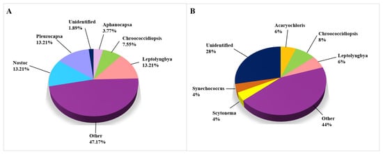 Figure 6 represents the cyanobacterial taxa that were isolated and identified on biodeteriorated CHL. The genera that occurred in less than 3% of studies are categorized under “Other” (purple fraction). Research on the cyanobacterial microbiome was carried out very evenly using both CD methods (53 taxa, Figure 6A) and CI methods (50 taxa, Figure 6B). The trend of a higher percentage of unidentified taxa on the genus level obtained using CI methods persists, since there are 28.00% of unidentified cyanobacterial taxa, while the same in the CD-based approaches research represents only 1.89%. The percentage of determined genera is shown in Figure 6. The most often encountered cyanobacterial genera were Leptolyngbia, Nostoc, and Pleurocapsa (each genus mentioned in 13.2% of studies), while the species Acaryochloris marina, Anabaena cylindrica, Loriellopsis cavernicola, and Nostoc punctiforme occurred in two articles (Supplemental Table S3).