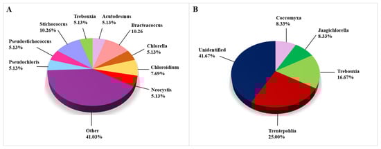 Algae identified on damaged limestone cultural heritage. (A) Algal genera identified using CD approaches (39 records obtained from 3 cultural heritage sites); (B) Genera of algae identified using CI approaches (12 records obtained from 5 cultural heritage sites).
