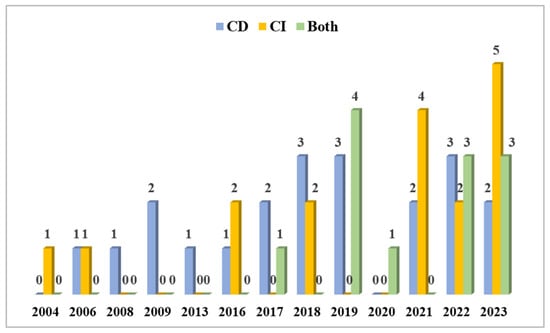 The number of molecular biology studies on CHL conducted using CD approaches, CI approaches, and both CD and CI approaches together through the years in ascending order.