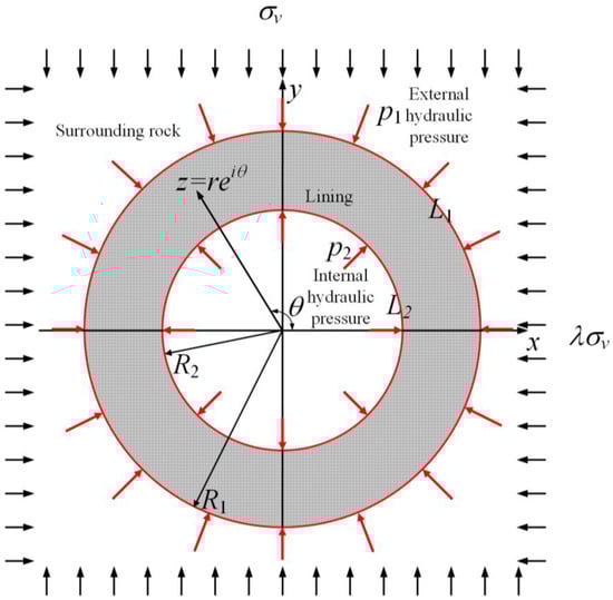 Assuming that the external and internal water pressures are p1 and p2, respectively, then, according to the external and internal water pressure conditions on the lining–surrounding rock contact surface L1 and the lining–inner wall boundary L2, we can obtain [4]: