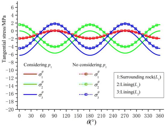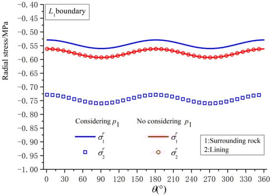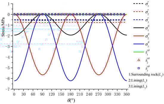 The relevant parameters were as follows [4]: circular tunnel radius R1 = 3.0 m; lining thickness 0.3 m (R2 = 2.7 m); vertical geostress σv = 1 MPa; lateral pressure coefficient λ = 0.5; tunnel external water pressure p1 = 0.2 MPa, internal water pressure p2 = 0.5 MPa; elastic modulus of surrounding rock and lining E1 = 1 GPa, E2 = 36 GPa; Poisson ratio μ1 = 0.25, μ2 = 0.22; displacement release coefficient η = 0.2. The stress results in this paper still stipulate that tensile stress is positive and compressive stress is negative. Using the method in this paper, the stress at the boundary of L1 and L2 was obtained, and the results are shown in Figure 2: