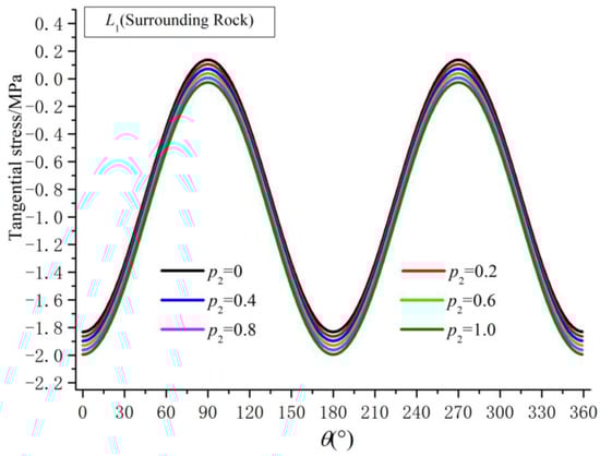 From Figure 5, it is evident that the tangential stress values of the surrounding rock exhibit sinusoidal variation. In the directions of θ = 90° and 270°, the tangential normal stress tends to be closer to a tensile stress state. As the internal water pressure (p2) increases, the tangential stress value curve remains largely consistent, with little numerical variation. This suggests that changes in internal water pressure have a relatively low sensitivity to the tangential stress of the surrounding rock.
