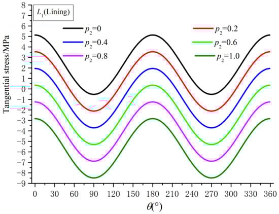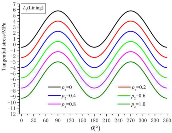 Conversely, the tangential normal stress of the lining at the L2 boundary is at its maximum in the θ = 90° and 270° directions, and at its minimum in the θ = 0°, 180°directions. With the increase in p2, the tangential normal stress of the lining at the L2 boundary undergoes a similar transition from tensile–compressive stress to complete compressive stress. Furthermore, an increment of ∆p2 = 0.2 MPa leads to a variation in tangential normal stress of ∆σθ = 2 MPa (compression).