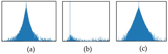 The activation distributions of three representative convolutional layers of the YOLOv3-tiny model. These distributions are asymmetric. The horizontal axis represents the activation value, and the vertical axis represents the activation density. (a) The activation distribution of layer 1. (b) The activation distribution of layer 23. (c) The activation distribution of layer 3.