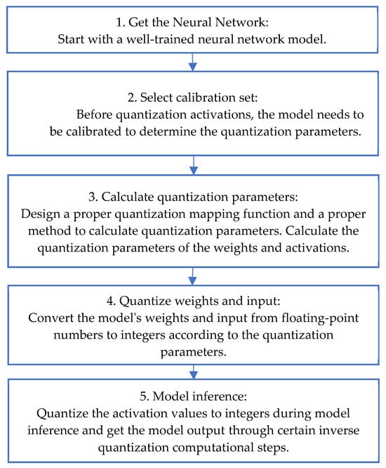 (1) There is a need for efficient computation of intelligent algorithms on the embedded devices. With the continuous progress of artificial intelligence technology, the application field of neural networks is also expanding. Due to the high computational complexity of intelligent algorithm models represented by neural networks, the contradiction between limited computational resources and the high computational demand of intelligent models seriously restricts the deployment of high-performance neural network models on end-side computing devices, which has become a bottleneck restricting the promotion and application of artificial intelligence technology [,,]. To address this problem, there is an urgent need to carry out research on quantization techniques for neural network models to reduce data storage, data transmission, and computational power. Modern neural networks, while highly effective, often require substantial computational resources and memory, which can be prohibitive for deployment on edge devices with limited hardware capabilities. By reducing the precision of the model’s weights and activations, quantization techniques aim to shrink the model size and enhance efficiency without significantly sacrificing performance.