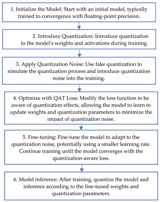 Quantization-aware training (QAT) is a technique in deep learning that integrates the quantization process into the training phase of a neural network model. Unlike post-training quantization (PTQ), which applies quantization after the model has been trained, QAT allows the model to learn and adapt to the quantization effects during training. The steps of QAT are shown in Figure 5.