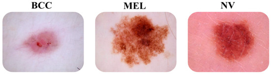 One of the most common types of skin cancer in the non-melanoma category is basal cell carcinoma (BCC). Basal cell carcinoma is the most widely recognized disease in people with a light complexion type and is consistently expanding in frequency [13,14]. In the melanoma category, there is one type, which is melanoma (MEL). Melanoma skin disease is viewed as the most serious of all malignant skin growths [15]. In certain individuals, we can see “moles” called “nevi”. They are non-cancerous skin lesions, but they can develop into skin cancer and manifest in various forms [16]. In a meta-examination on nevi as hazard factors for melanoma, the most noteworthy gamble (around 7-fold) for melanoma was seen in people with an excess of 100 nevi [17].