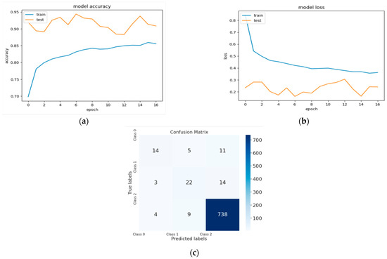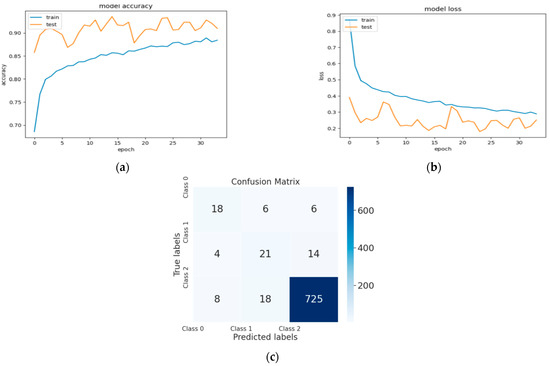 (a) The validation accuracy curve of Model 3; (b) the validation loss curve of Model 3; and (c) the confusion matrix of Model 3.