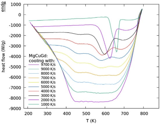 Fast scanning calorimetry of MgCuGd glasses at different cooling rates. A distinct peak (glass transition) diminishes at high cooling rates, indicating a shift in the glass formation mechanism (reprinted with permission via CC Attribution 4.0 License) [56].