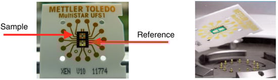 MultiSTAR UFS 1 MEMS chip sensors for sample loading: sample and reference sensor sites are on the left, while the 14 connectors of the Flash DSC (fast scanning calorimetry instrument by Mettler Toledo) are on the right (reprinted with permission via CC Attribution 4.0 License) [54].
