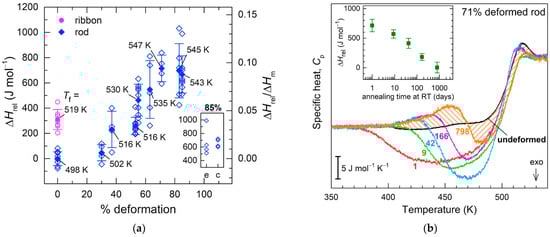 (a) The increase in enthalpy (ΔH) after compression at varying degrees of deformation and (b) specific heat curves show a shift in thermal behavior of the material with increasing heating rate from 1 to 798 K min−1 (reprinted with permission via CC Attribution 4.0 License; multiple Figures were merged for a better overview of the authors’ work) [65].