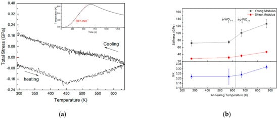(a) The change in total stress as a function of heating and (b) varying moduli as a function of annealing temperature for deposited tungsten oxide coatings. The blue line, G/K represents a shear to bulk modulus ratio, which is representative of the ductility of the material. It can be seen that the stiffness increases during crystallization and grain growth, followed by an increase in density. (reprinted with permission via CC Attribution 4.0 License; multiple Figures were merged for a better overview of the authors’ work) [77].