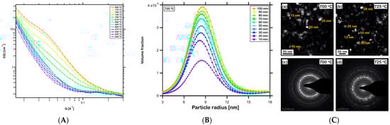 Mattern et al. studied the change in structure of Pd40Cu30Ni10P20 metallic glass during thermal annealing in situ via synchrotron X-ray diffraction. They confirmed that in the glassy state, thermal expansion is accompanied by atomic rearrangements and an increase in larger interatomic distances [83]. Using small-angle neutron scattering combined with X-ray diffraction, Paul et al. studied the safe temperatures at which a Fe48Cr15Mo14Y2C15B6 bulk metallic glass can operate by spark plasma sintering the samples to up to 800 °C [84]. X-ray diffraction showed the appearance of (Fe,Cr)23C6 crystals, while the measured scattering intensity, which was fitted to a size distribution model based on the maximum entropy model, showed that the formed crystals were in the size range between 3 and 18 nm, and that they originated from already pre-existing nuclei formed during the rapid quenching process. This was concluded from a kinetics study, which was performed on behalf of the size distributions that were obtained from the measurements (Figure 5).