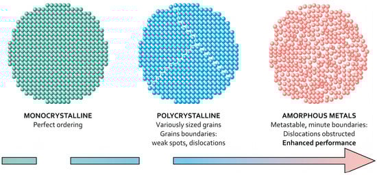Scheme of how structural organization yields beneficial performance of amorphous metals.