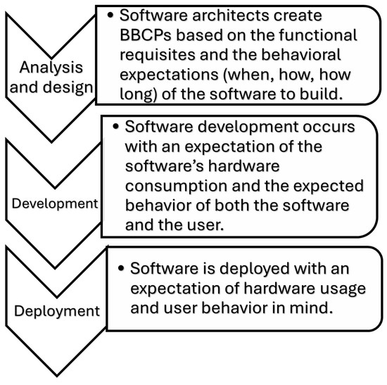 To us, the behavior of software is “the collection of functions/methods, variables involved in the functions/methods, and the involvement of external entities required to produce a predictable outcome, all limited to a single unit of software”. As we have previously mentioned, our research also involves “behavior with software”. We define the behavior with software as “the interactions of a software agent or non-digital agent with its environment, ignoring the inner workings of the agent itself”, where a software agent is an autonomous software entity that can summon itself proactively or reactively, and operate in its environment without a user’s intervention. Finally, non-digital agents conserve the attributes of a software agent but they can be partially controlled or influenced by software and can act upon a tangible environment. Some examples of non-digital agents include human users and autonomous machines in cyber-physical systems. We designate human users as non-digital agents because, although they do not host software themselves, they can form relationships with software and software agents. These relationships have the potential to impact the physical world. In the analysis phase of the SDLC, the behavior with software is useful to comprehend how the human–computer interaction (HCI) will affect software behavior and vice versa, denoting how energy relationships can be created between the user and the software.