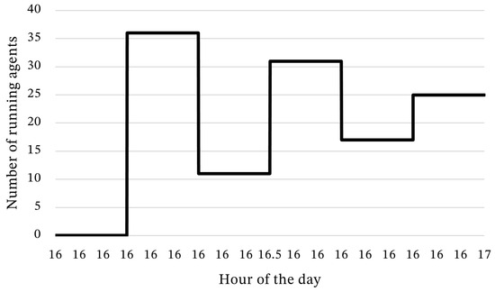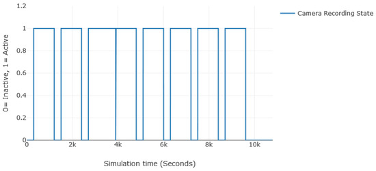 To summarize how usage constraints and run constraints are utilized, let us think of an example of a surveillance system, more specifically, the software responsible for recording suspicious activity. As per a hypothetical surveillance policy, the software must record at least 10 min of footage with 5 min between recordings. However, if the system sees it fit to do so due to uncontrolled variables, such as a motion sensor, the footage could keep rolling up to 20 min with a maximum daily footage duration of 1200 min (20 h). To replicate this behavior, we can use a Profile Evaluation Rate equal to 0.00333 Hz, as we have to record every 5 min. A Default Run Probability of 1 and a Default Stop Probability of 0.7 can control an irregular switch between states every 5 min. However, to enforce a minimum of 10 min of footage and a maximum of 20, we set the Minimum Run Time to 600 s (10 min) and the Maximum Run Time to 1200 s (20 min). To enforce the maximum daily footage, the Quota is set to 72,000 s (1200 min), and the Cooldown is dynamically set (set by the interpreter) to the time left until the next day. The final result is a behavior that complies with the deliberate requirements of the software in addition to the variability of uncontrolled circumstances that could affect the results. The plot in Figure 5 describes the change in the recording state of the camera according to its usage and run constraints over 3 h.